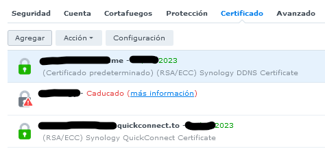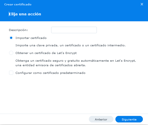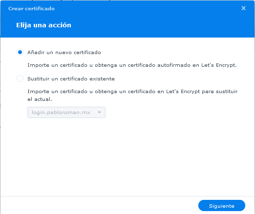 Selecciona la opción “Agregar” para agregar o importar un certificado para el subdominio que configuraste a tu DSM.